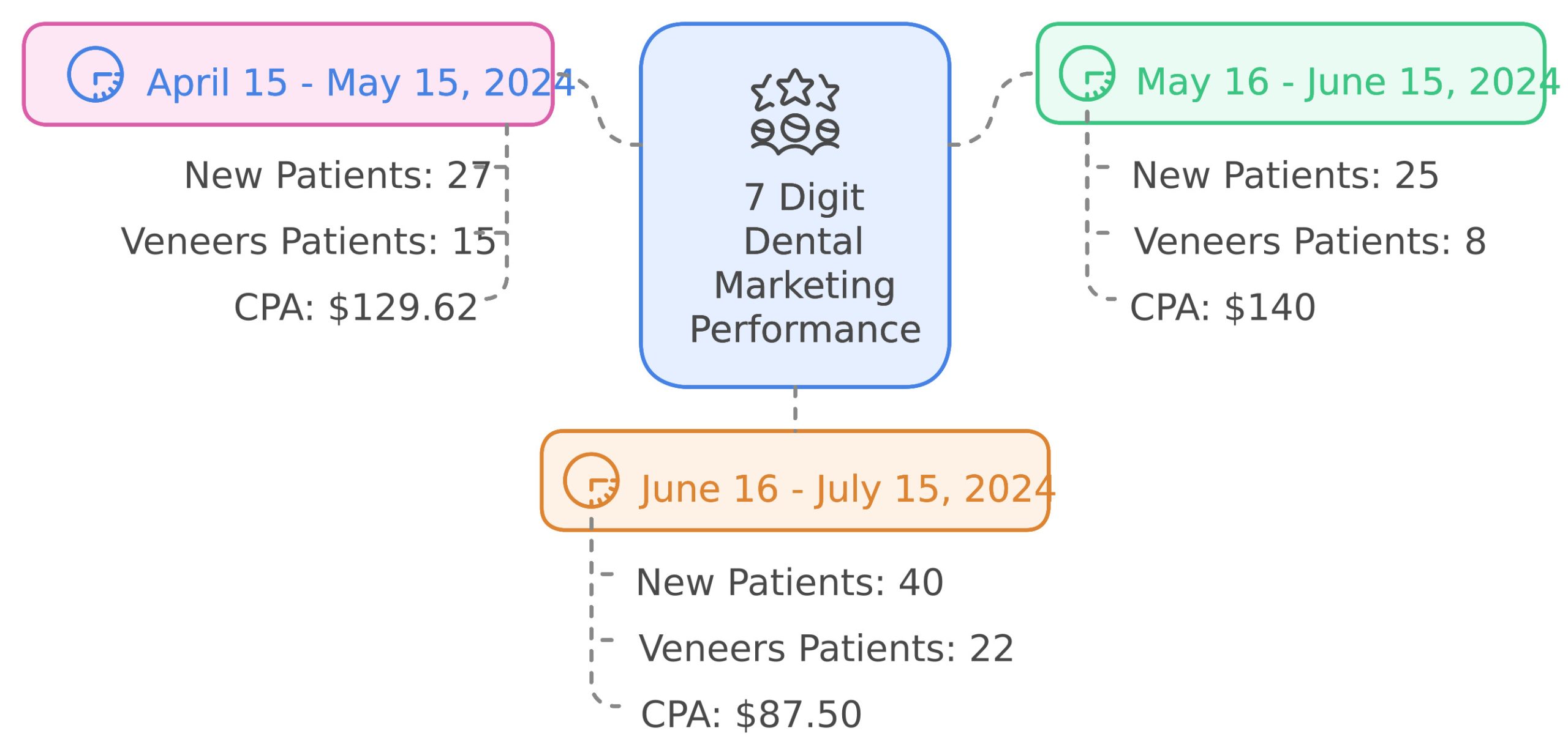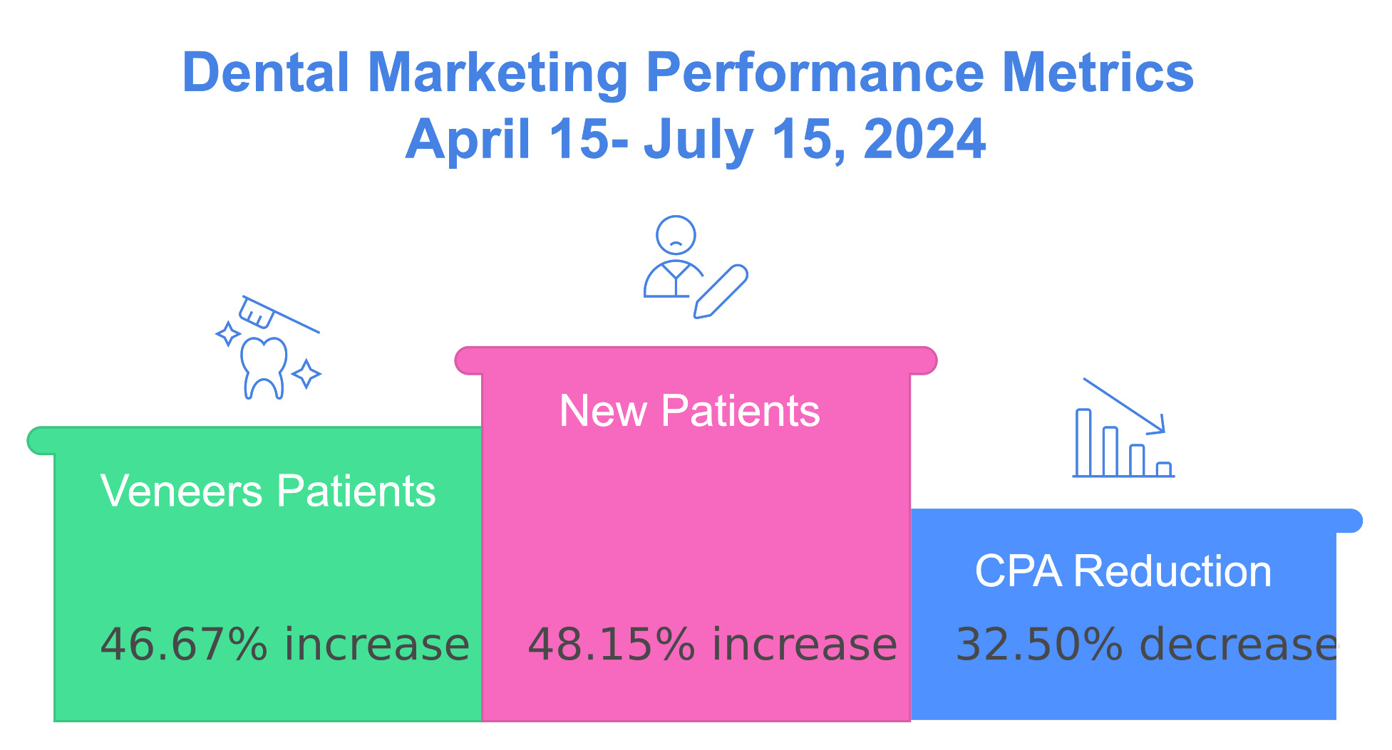 Between April 15 and July 15, 2024, 7 Digit Dental Marketing implemented a series of digital marketing campaigns using SEO, PPC and Remarketing strategies. Despite the budget constraints, 7 Digit Dental Marketing used its expertise to optimize each campaign. This approach allowed 7 Digit Dental Marketing to generate valuable leads specifically for porcelain veneers, while also reducing the client’s cost per acquisition over the duration of the campaign.